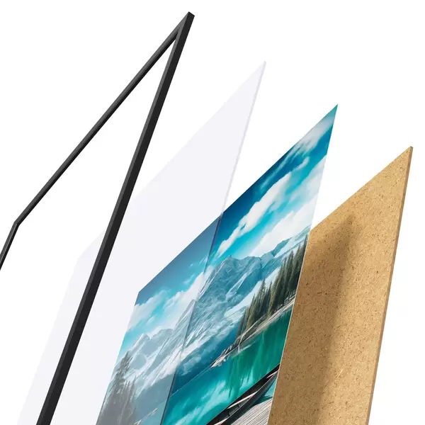 Das Poster besteht aus einem Rahmen, Plexiglas, einem gedruckten Bild und einer Rückwand aus Spanplatten. Dank der Halterungen auf der Rückseite kann das Poster sofort an die Wand gehängt werden.