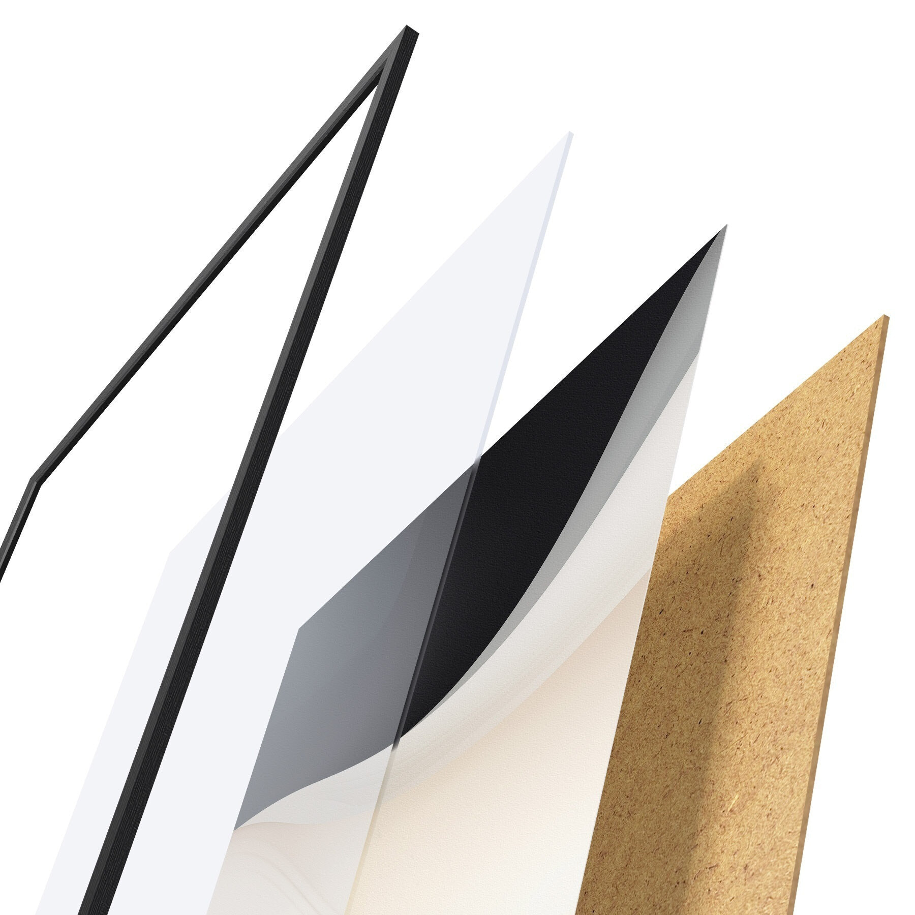 Das Poster besteht aus einem Rahmen, Plexiglas, einem gedruckten Bild und einer Rückwand aus Spanplatten. Dank der Halterungen auf der Rückseite kann das Poster sofort an die Wand gehängt werden.