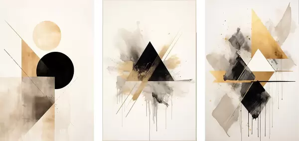 Poster Geometrische Dreiecke mit Tintenflecken, schwarz und ockerfarben Nr d00963