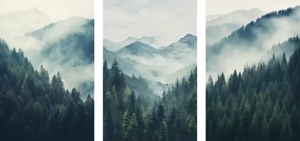 Poster Nebelverhangene Kiefernberge in sanften Grün- und Blautönen d00964