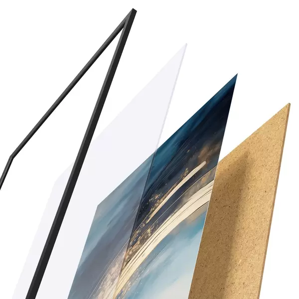 Das Poster besteht aus einem Rahmen, Plexiglas, einem gedruckten Bild und einer Rückwand aus Spanplatten. Dank der Halterungen auf der Rückseite kann das Poster sofort an die Wand gehängt werden.