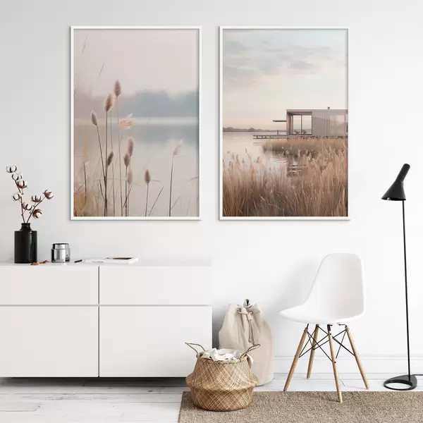 Poster Weiche Schilfpflanzen an einem ruhigen See und eine moderne Hütte am Ufer Nr d00970