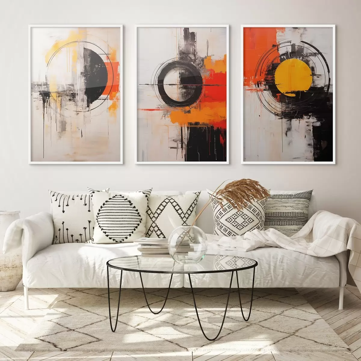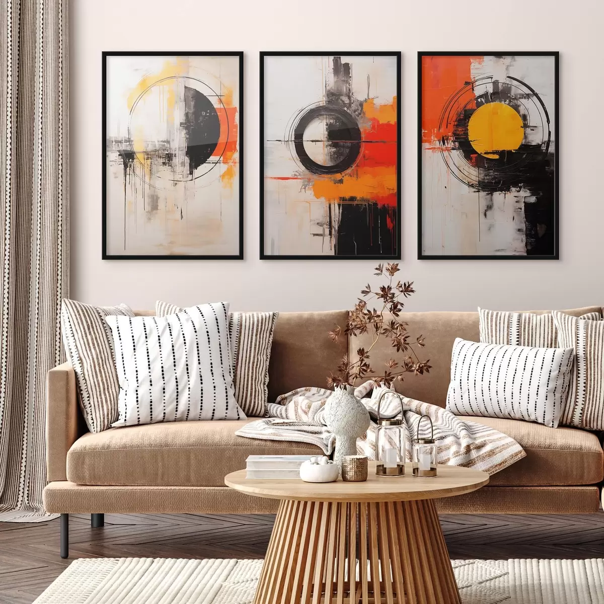 Poster Strukturierte Kreise und kräftige Striche in Schwarz, Ocker und Orange Nr d00974