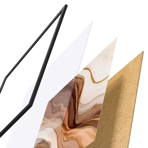 Das Poster besteht aus einem Rahmen, Plexiglas, einem gedruckten Bild und einer Rückwand aus Spanplatten. Dank der Halterungen auf der Rückseite kann das Poster sofort an die Wand gehängt werden.