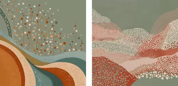 Poster Zweiteilige abstrakte Landschaft mit gepunkteten und wellenförmigen Elementen d00987
