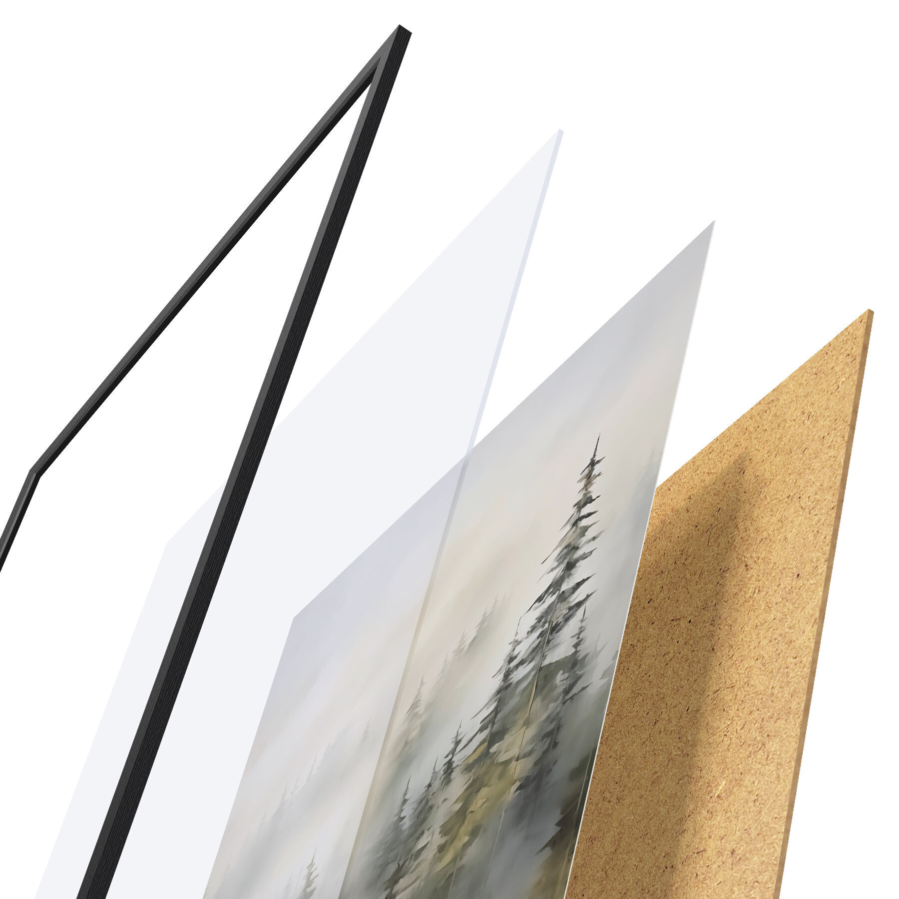 Das Poster besteht aus einem Rahmen, Plexiglas, einem gedruckten Bild und einer Rückwand aus Spanplatten. Dank der Halterungen auf der Rückseite kann das Poster sofort an die Wand gehängt werden.