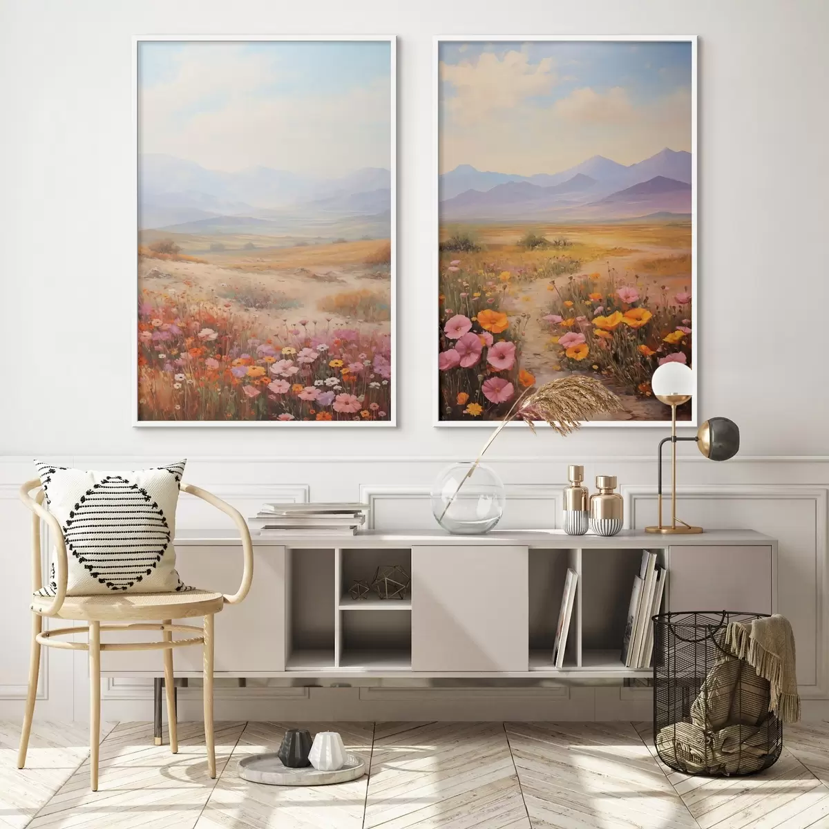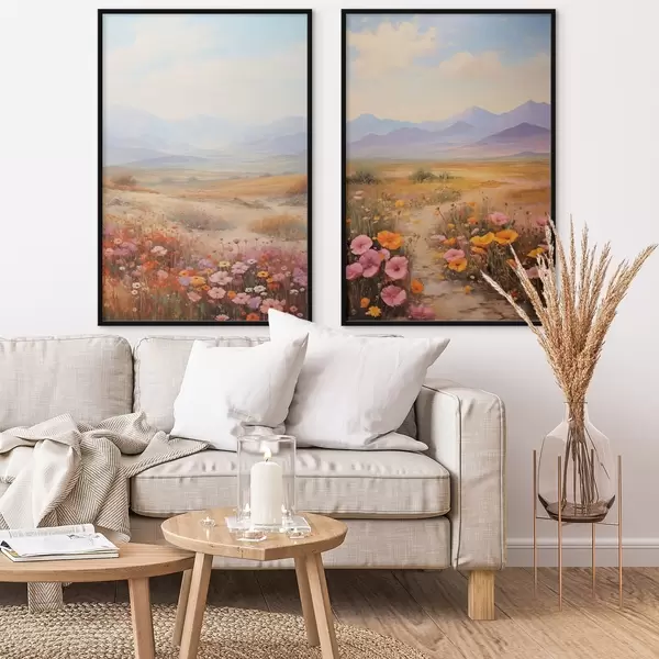 Poster Landschaft, ein Feld voller bunter Blumen mit Bergen im Hintergrund, sanfte Pastellfarben Nr d01003