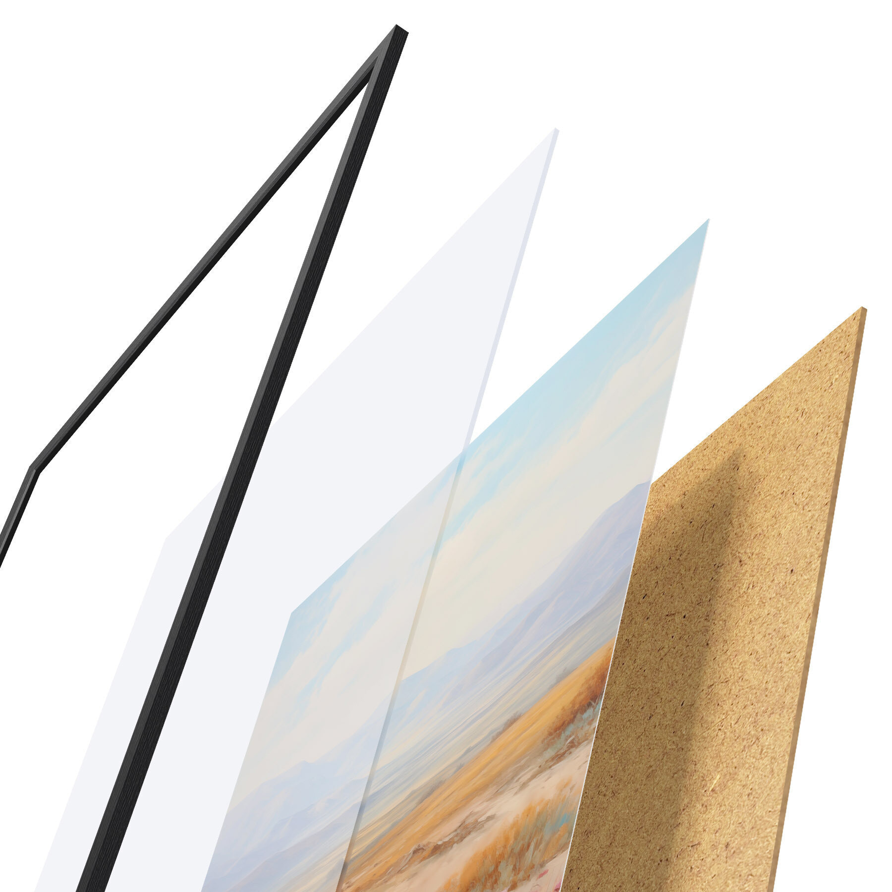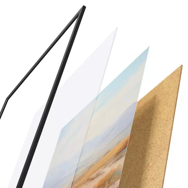 Das Poster besteht aus einem Rahmen, Plexiglas, einem gedruckten Bild und einer Rückwand aus Spanplatten. Dank der Halterungen auf der Rückseite kann das Poster sofort an die Wand gehängt werden.