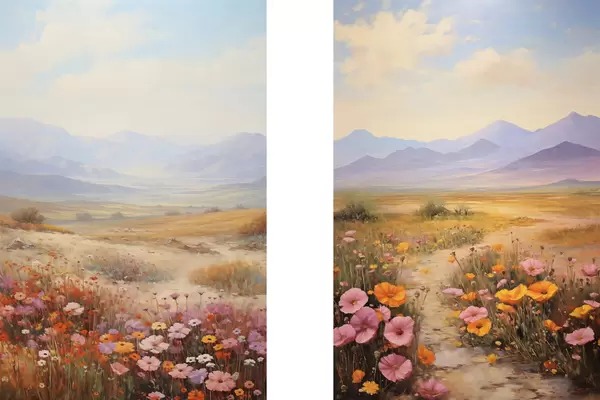 Poster Landschaft, ein Feld voller bunter Blumen mit Bergen im Hintergrund, sanfte Pastellfarben Nr d01003