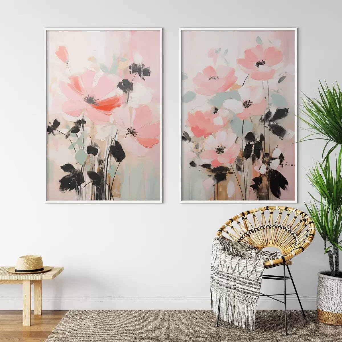 Poster Rosa und schwarze Blumen mit Blättern, sanfte Pastellfarben, abstraktes Blumenarrangement, minimalistische Kunst d01004