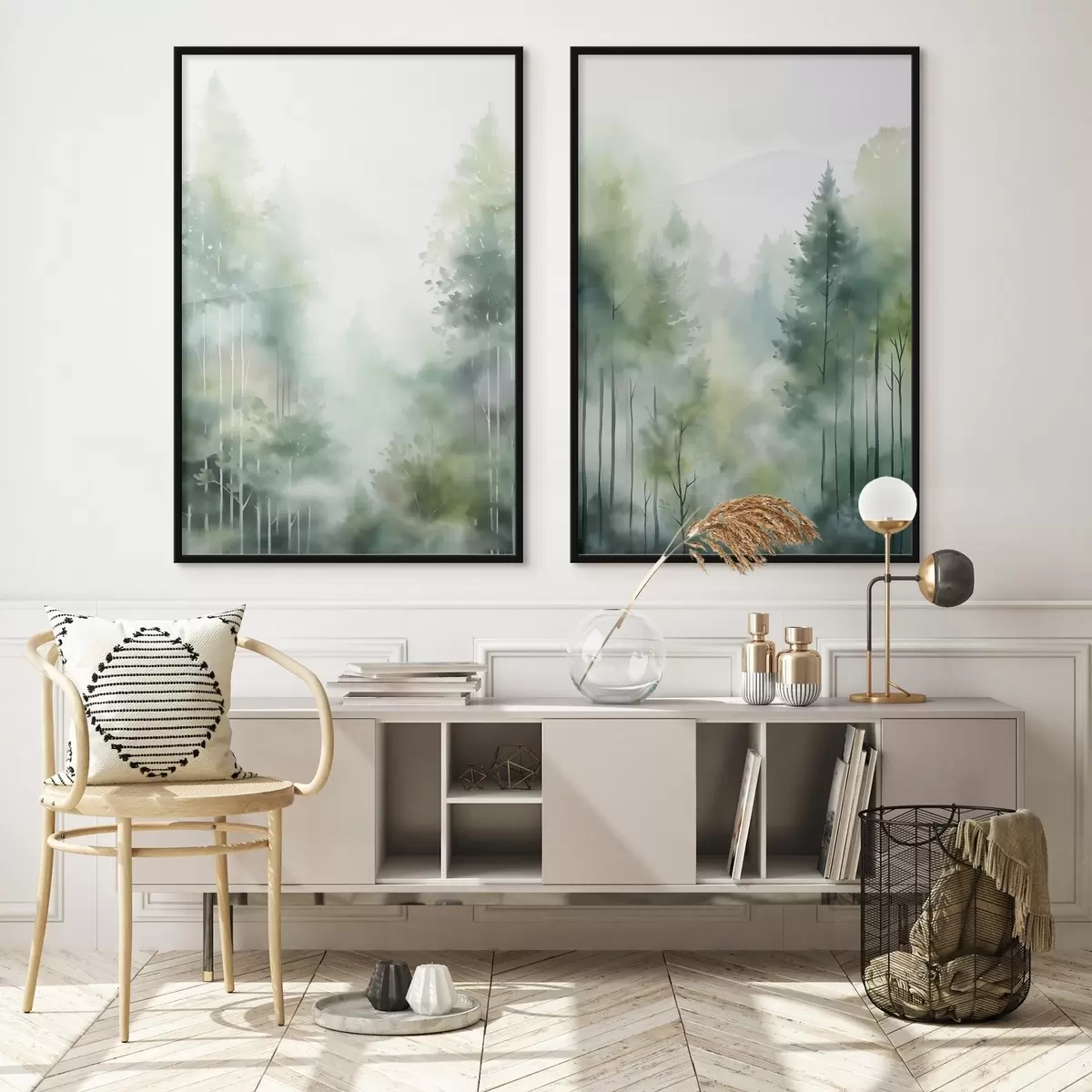 Poster Aquarellmalerei, die einen abstrakten Wald mit hohen Bäumen und grünem Laub imitiert, in sanften, gedämpften Farben Nr d01005