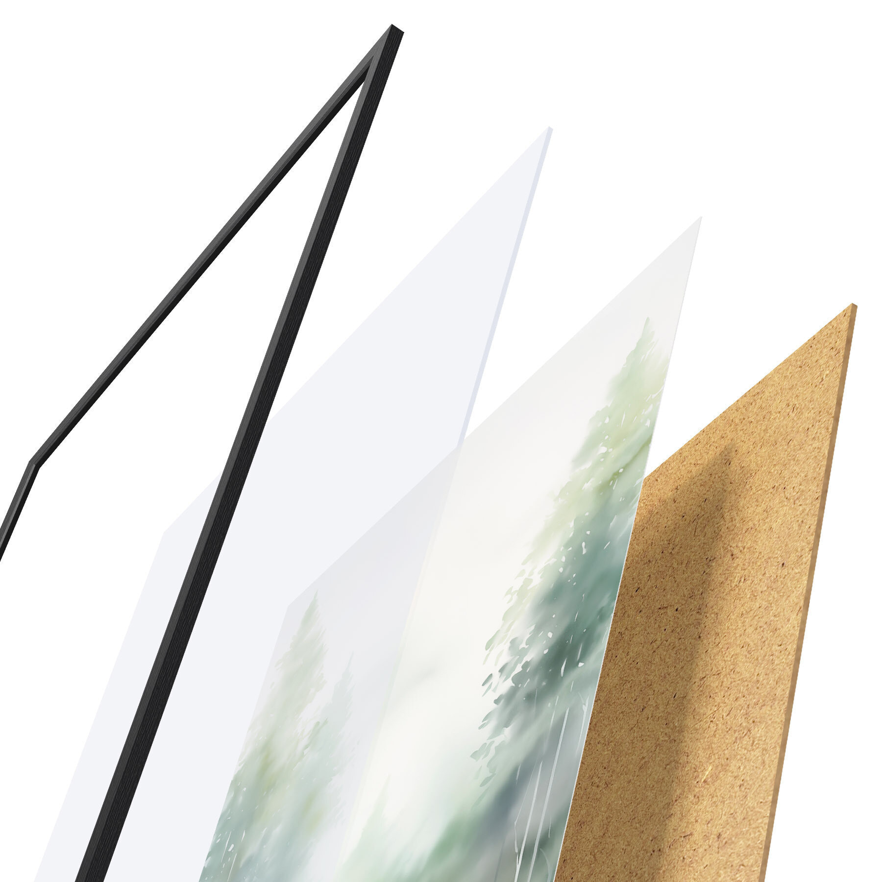 Das Poster besteht aus einem Rahmen, Plexiglas, einem gedruckten Bild und einer Rückwand aus Spanplatten. Dank der Halterungen auf der Rückseite kann das Poster sofort an die Wand gehängt werden.