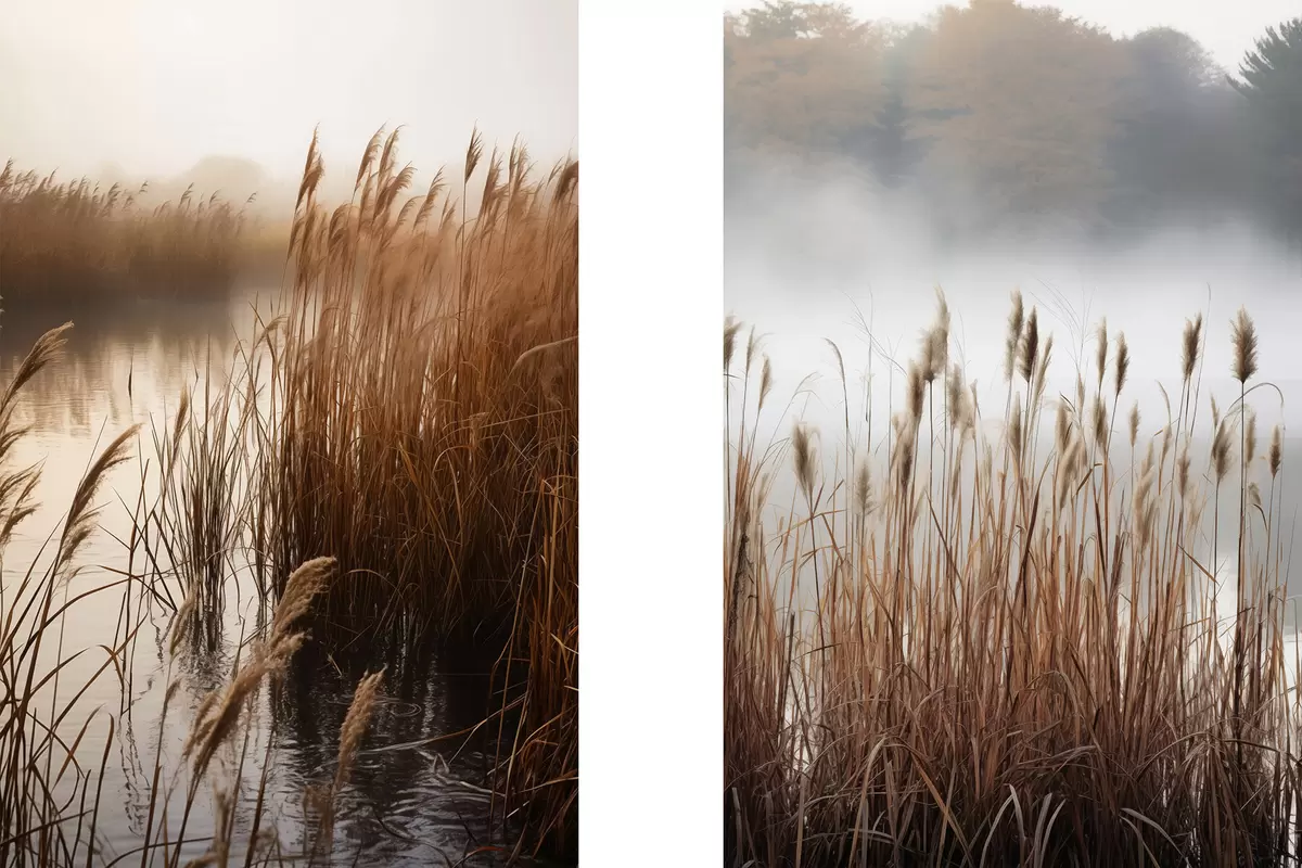 Poster Hohe Schilfpflanzen wachsen in einem Gewässer, das Wasser spiegelt die Schilfpflanzen wider, nebliger Hintergrund, sanftes Licht, Naturszene Nr d01008