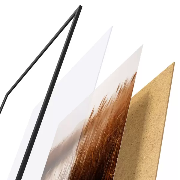 Das Poster besteht aus einem Rahmen, Plexiglas, einem gedruckten Bild und einer Rückwand aus Spanplatten. Dank der Halterungen auf der Rückseite kann das Poster sofort an die Wand gehängt werden.