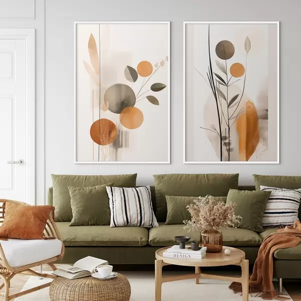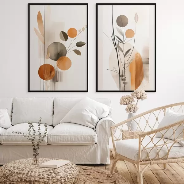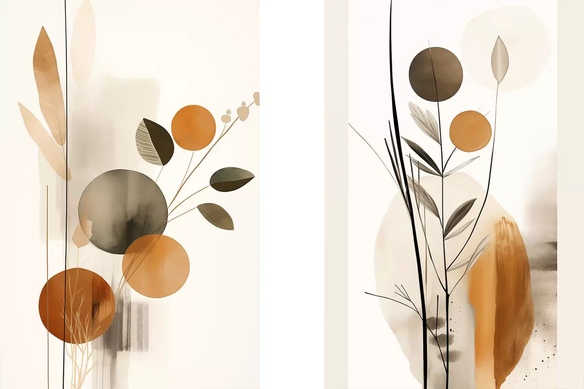 Poster Abstrakte Malerei-Imitation mit orangefarbenen und grauen Kreisen, Blättern und Zweigen, moderner Stil, Aquarelleffekt Nr d01009