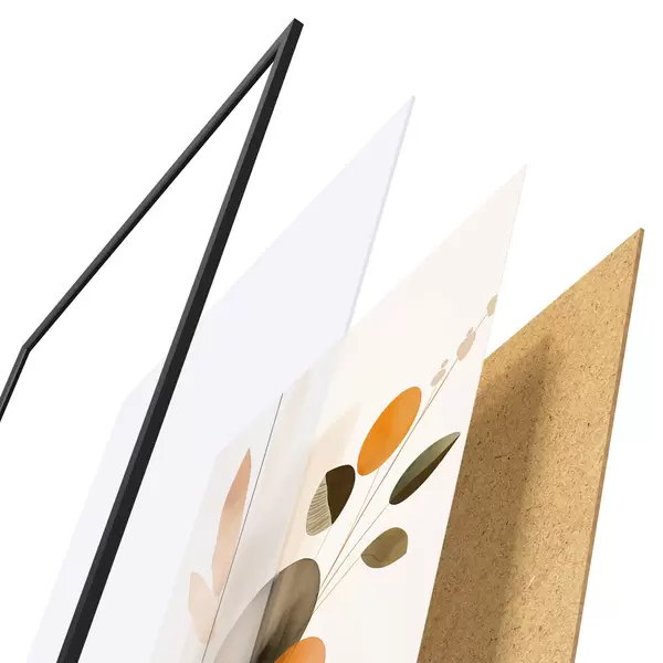 Das Poster besteht aus einem Rahmen, Plexiglas, einem gedruckten Bild und einer Rückwand aus Spanplatten. Dank der Halterungen auf der Rückseite kann das Poster sofort an die Wand gehängt werden.