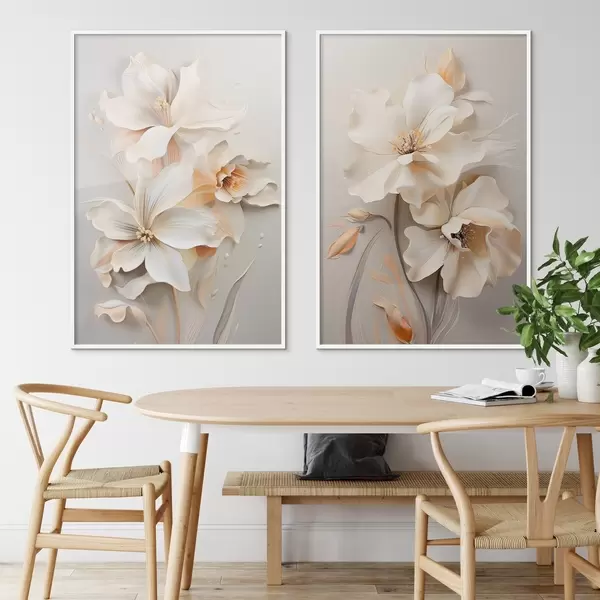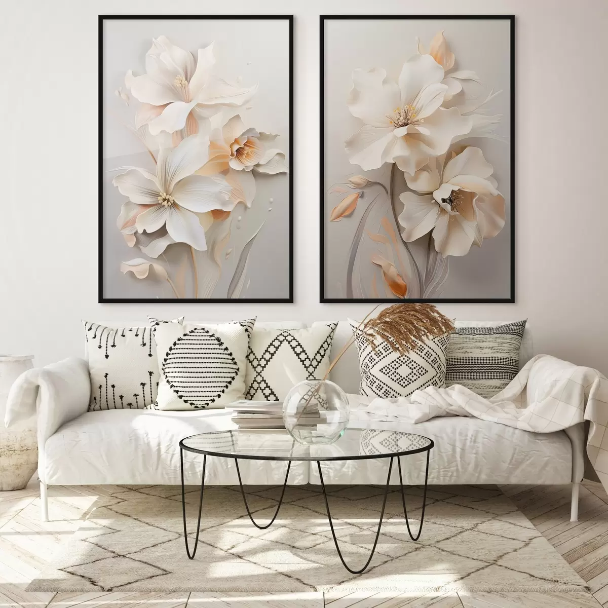 Poster Weiße Blumen, Blütenblätter mit sanften Schatten, hellbeiger Hintergrund, elegante Komposition, minimalistischer Stil d01010