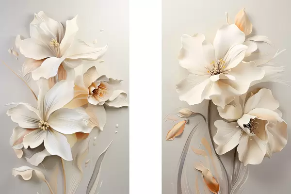 Poster Weiße Blumen, Blütenblätter mit sanften Schatten, hellbeiger Hintergrund, elegante Komposition, minimalistischer Stil d01010
