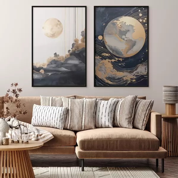 Poster Strukturierter dekorativer Planet im Weltraum mit gelben Linien und Punkten, abstrakter Stil, minimalistisch und modern Nr d01014