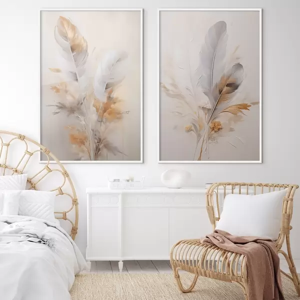Poster Abstrakte Federn, umgeben von beigen und braunen Federn, weich und zart, auf hellbeigem Hintergrund Nr d01016