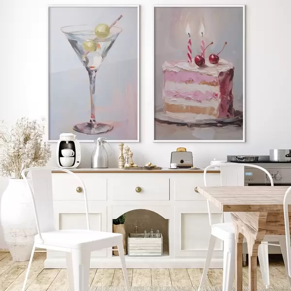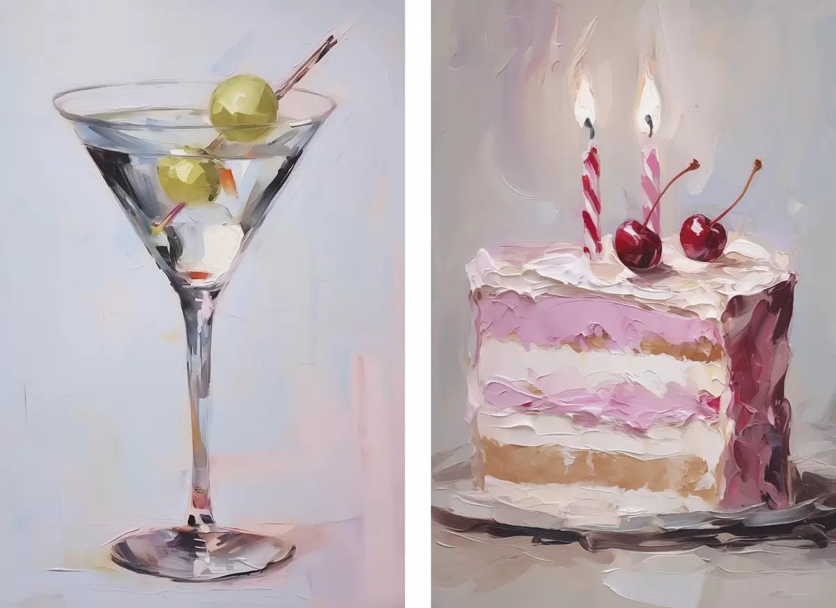 Poster Ein Glas mit einem Getränk und einem Stück Kuchen – Imitationsgemälde Nr d01019