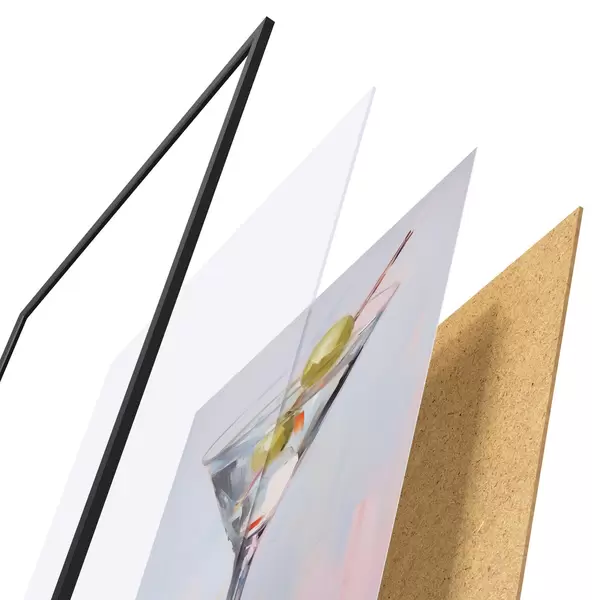 Das Poster besteht aus einem Rahmen, Plexiglas, einem gedruckten Bild und einer Rückwand aus Spanplatten. Dank der Halterungen auf der Rückseite kann das Poster sofort an die Wand gehängt werden.