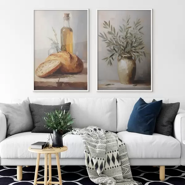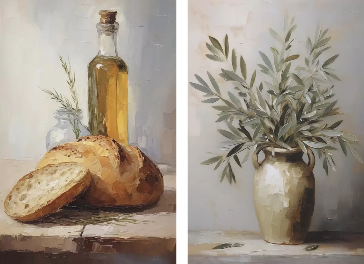 Poster Olivenzweige in einer Vase, Brot und eine Flasche Öl, Gemäldeimitation Nr d01035