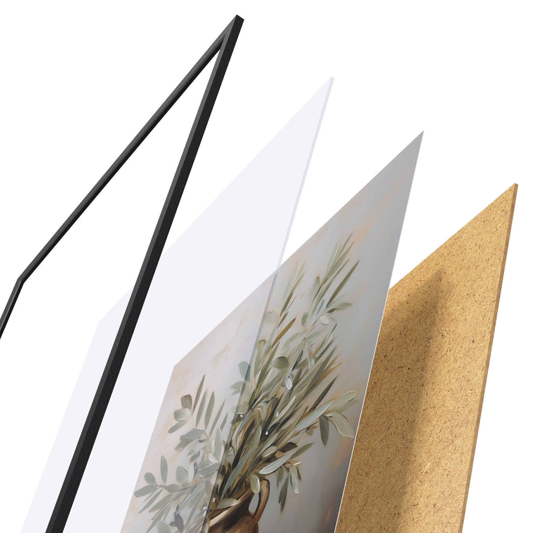 Poster Olivenzweige in einer Vase, Brot und eine Flasche Öl, Gemäldeimitation d01035