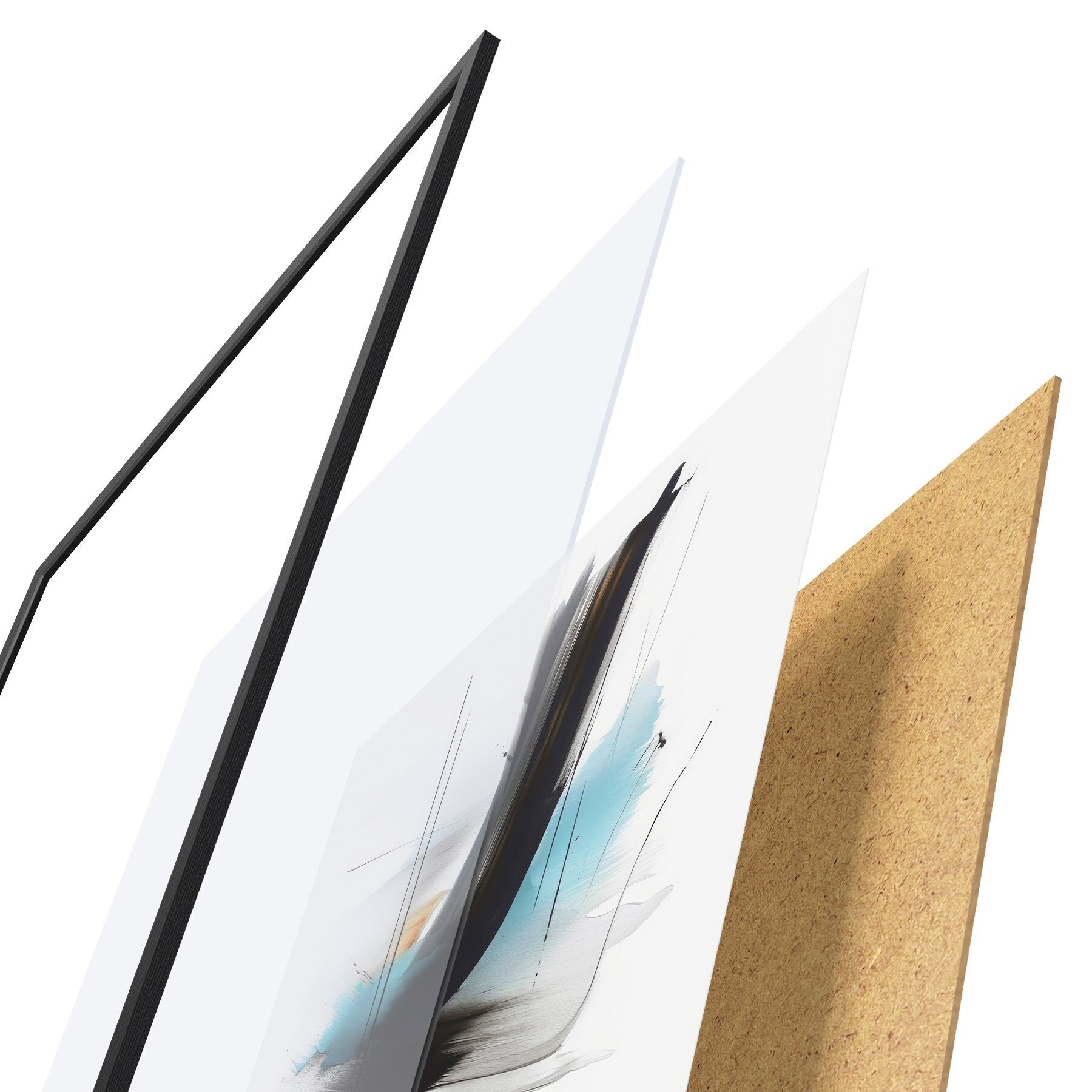 Das Poster besteht aus einem Rahmen, Plexiglas, einem gedruckten Bild und einer Rückwand aus Spanplatten. Dank der Halterungen auf der Rückseite kann das Poster sofort an die Wand gehängt werden.