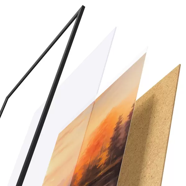 Das Poster besteht aus einem Rahmen, Plexiglas, einem gedruckten Bild und einer Rückwand aus Spanplatten. Dank der Halterungen auf der Rückseite kann das Poster sofort an die Wand gehängt werden.