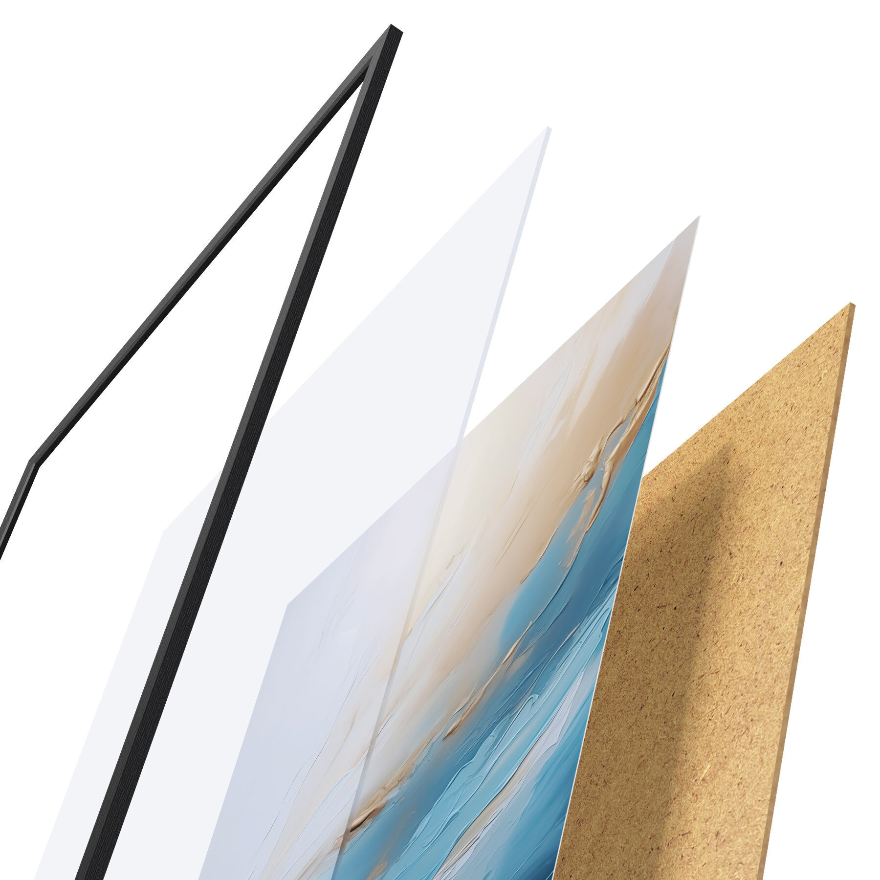 Das Poster besteht aus einem Rahmen, Plexiglas, einem gedruckten Bild und einer Rückwand aus Spanplatten. Dank der Halterungen auf der Rückseite kann das Poster sofort an die Wand gehängt werden.