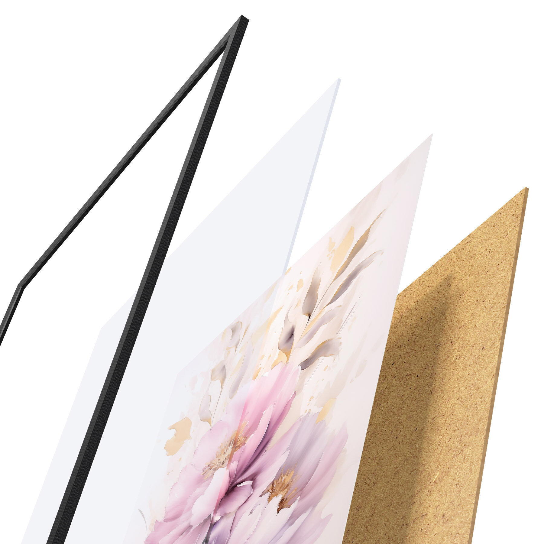Das Poster besteht aus einem Rahmen, Plexiglas, einem gedruckten Bild und einer Rückwand aus Spanplatten. Dank der Halterungen auf der Rückseite kann das Poster sofort an die Wand gehängt werden.