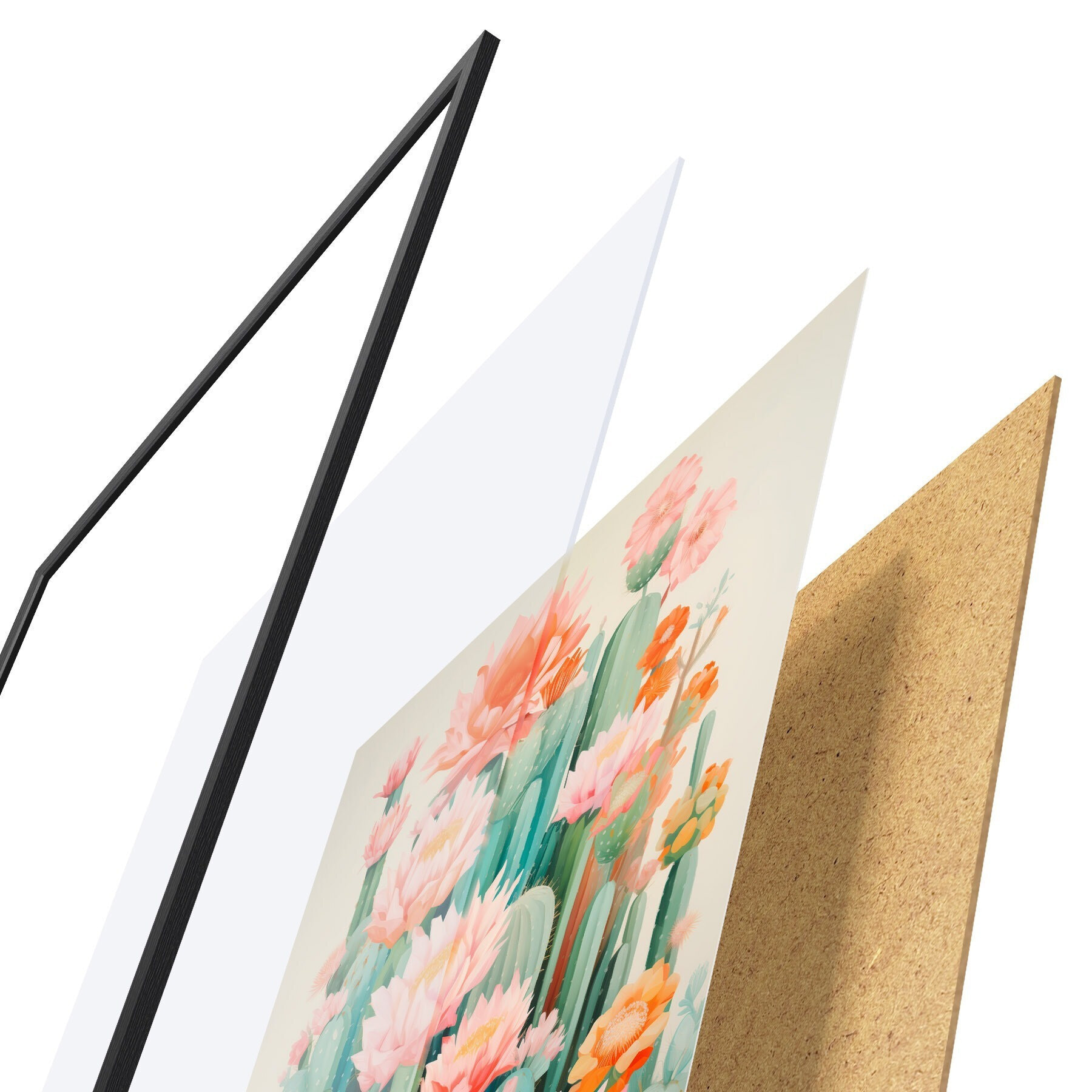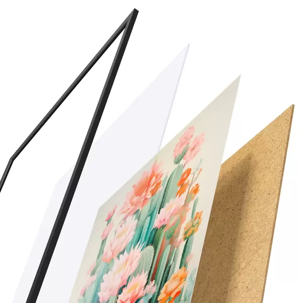 Das Poster besteht aus einem Rahmen, Plexiglas, einem gedruckten Bild und einer Rückwand aus Spanplatten. Dank der Halterungen auf der Rückseite kann das Poster sofort an die Wand gehängt werden.