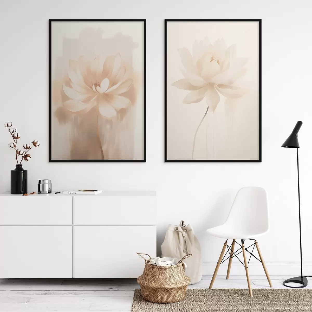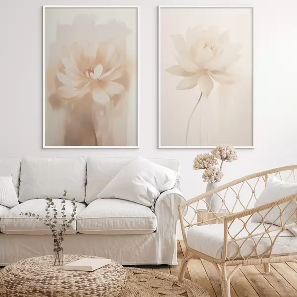 Poster Blumenkomposition in warmen Beigetönen mit leichten Pinselstrichen und einem luftigen Hintergrund Nr d01087