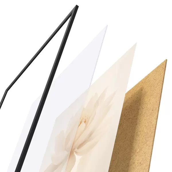 Das Poster besteht aus einem Rahmen, Plexiglas, einem gedruckten Bild und einer Rückwand aus Spanplatten. Dank der Halterungen auf der Rückseite kann das Poster sofort an die Wand gehängt werden.