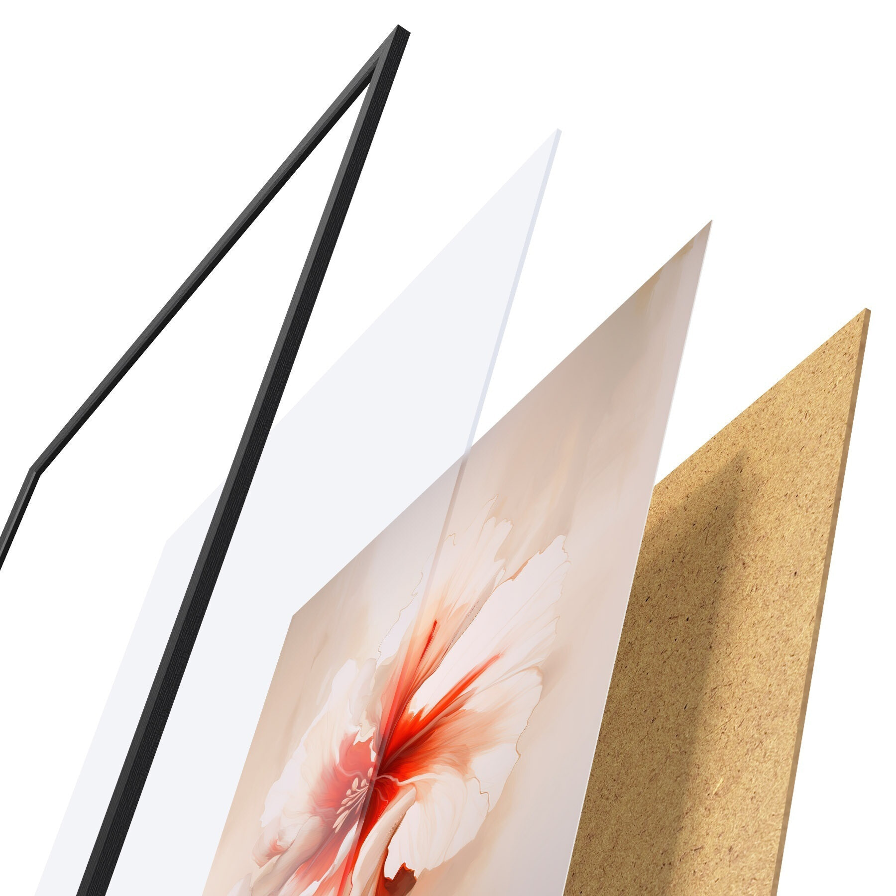 Das Poster besteht aus einem Rahmen, Plexiglas, einem gedruckten Bild und einer Rückwand aus Spanplatten. Dank der Halterungen auf der Rückseite kann das Poster sofort an die Wand gehängt werden.