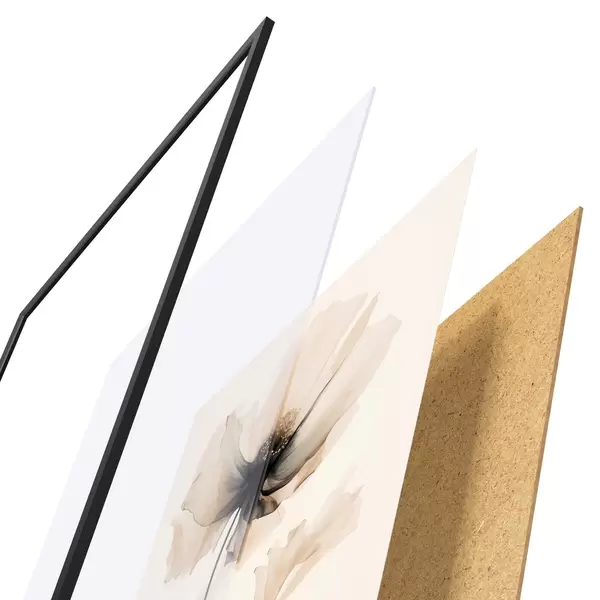 Das Poster besteht aus einem Rahmen, Plexiglas, einem gedruckten Bild und einer Rückwand aus Spanplatten. Dank der Halterungen auf der Rückseite kann das Poster sofort an die Wand gehängt werden.