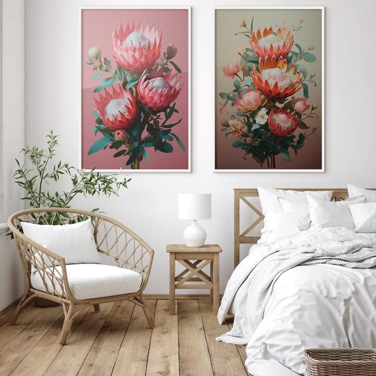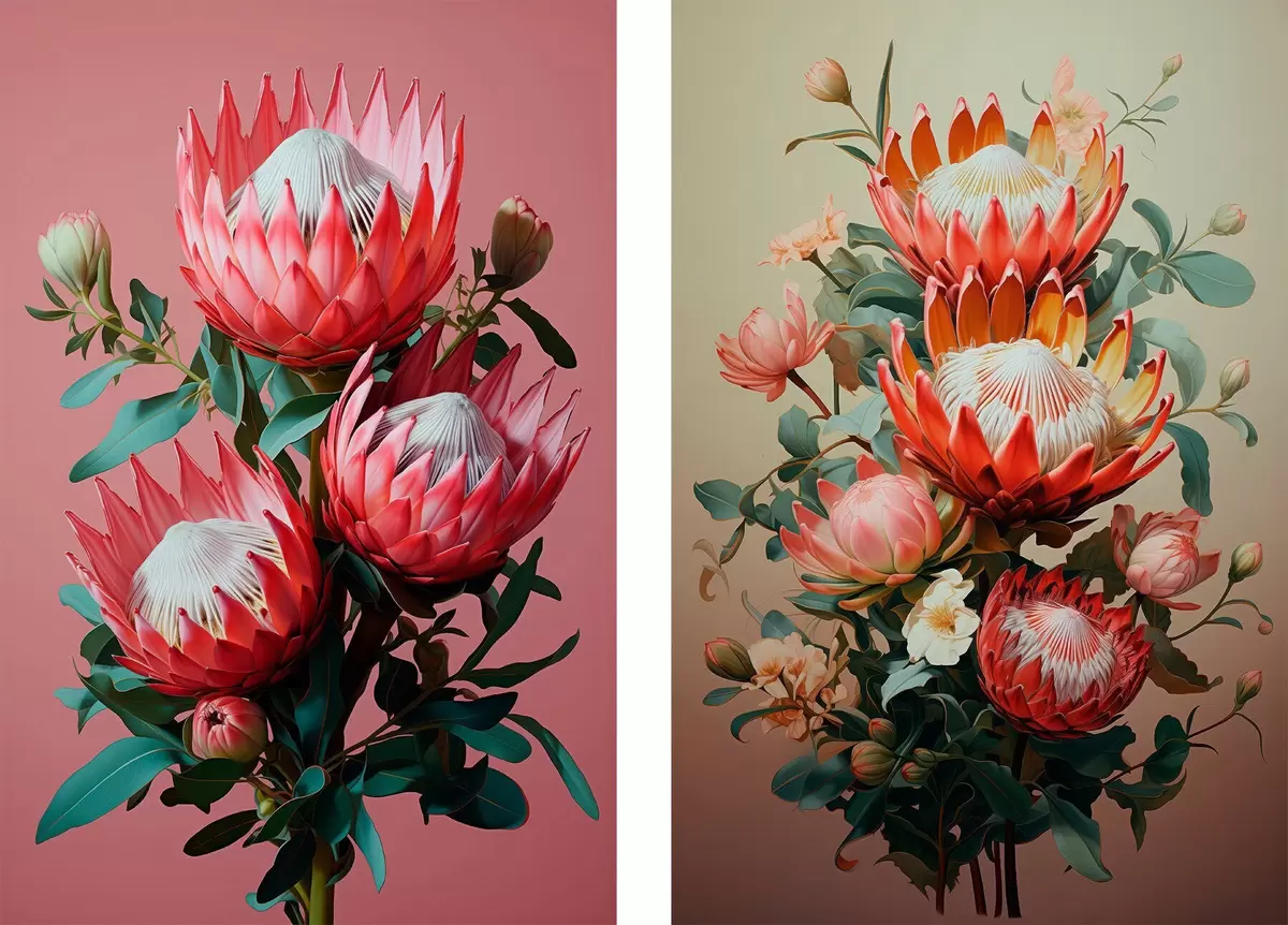 Poster Proteas in zwei Stimmungen: satter rosa Hintergrund und warmer Olivgrün-Farbverlauf d01092