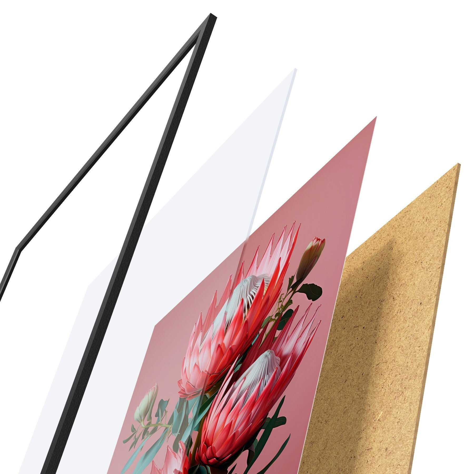 Das Poster besteht aus einem Rahmen, Plexiglas, einem gedruckten Bild und einer Rückwand aus Spanplatten. Dank der Halterungen auf der Rückseite kann das Poster sofort an die Wand gehängt werden.