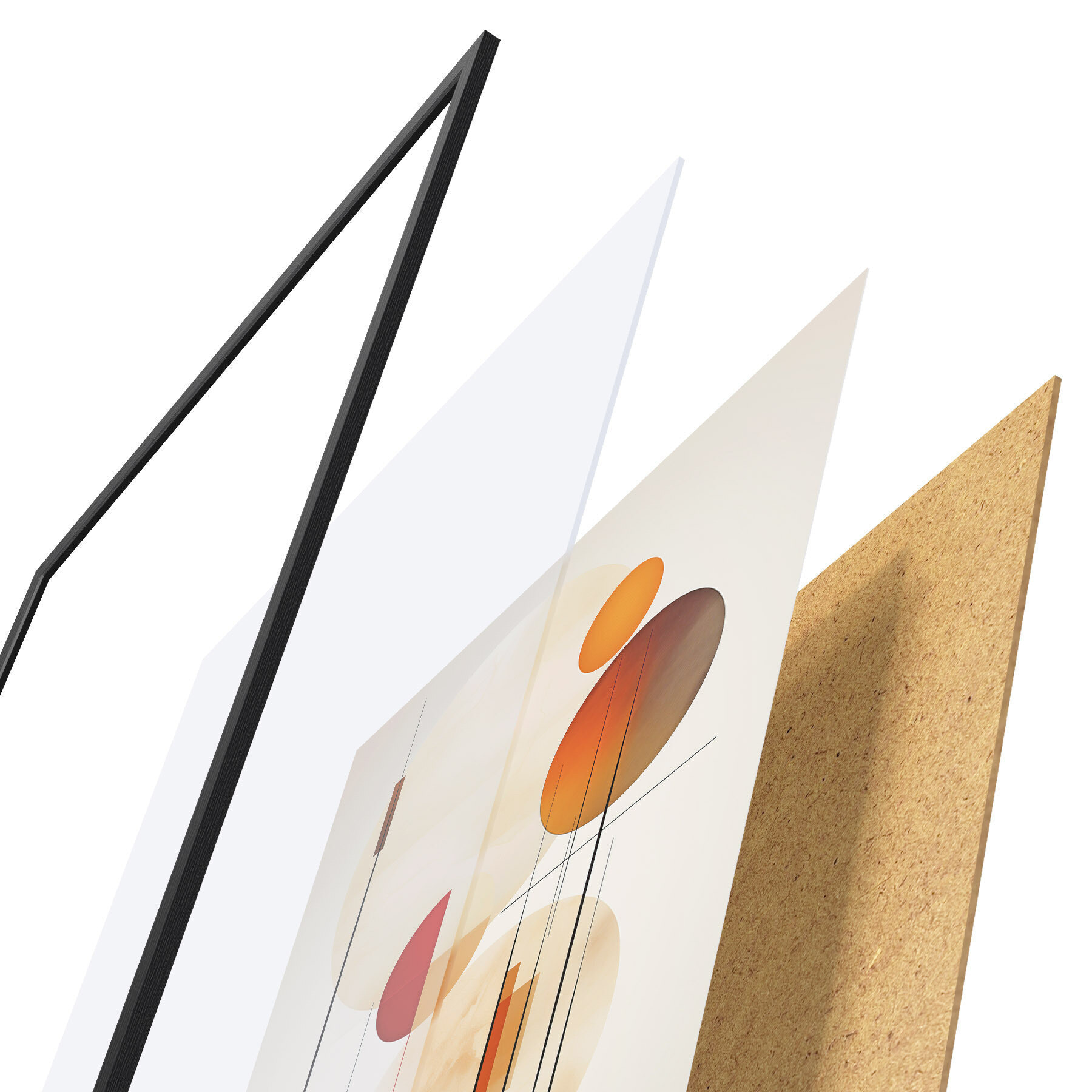 Das Poster besteht aus einem Rahmen, Plexiglas, einem gedruckten Bild und einer Rückwand aus Spanplatten. Dank der Halterungen auf der Rückseite kann das Poster sofort an die Wand gehängt werden.