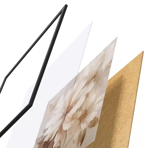 Das Poster besteht aus einem Rahmen, Plexiglas, einem gedruckten Bild und einer Rückwand aus Spanplatten. Dank der Halterungen auf der Rückseite kann das Poster sofort an die Wand gehängt werden.