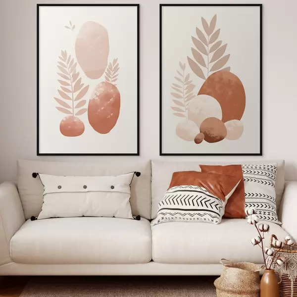 Poster Abstrakte Formen, strukturierte Steine und Blätter in gedeckten Pfirsich- und Terrakottatönen, minimalistisch, cremefarbener Hintergrund Nr d01114