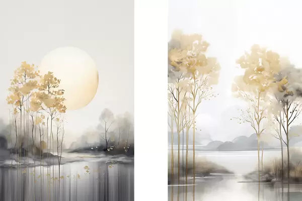 Poster Dekorative abstrakte Landschaft, hohe Bäume mit gelben Blättern, ein Fluss und Nebel im Hintergrund Nr d01115