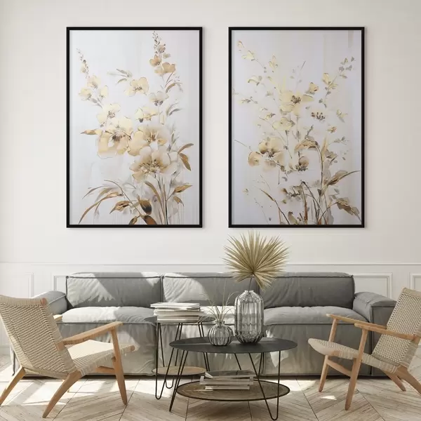 Poster Strukturierte gelbe Blüten und Blätter vor weißem Hintergrund, mit zarten Pinselstrichen d01116