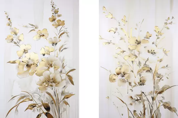 Poster Strukturierte gelbe Blüten und Blätter vor weißem Hintergrund, mit zarten Pinselstrichen Nr d01116
