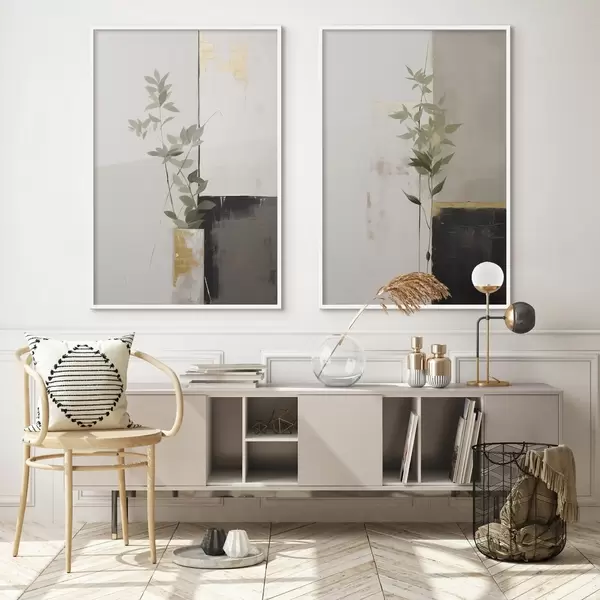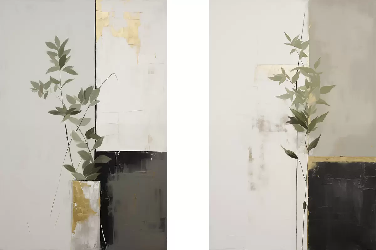 Poster Ein minimalistisches, strukturiertes Gemälde einer Vase mit grünen Blättern vor einem Hintergrund aus abstrakten geometrischen Formen. Nr d01126