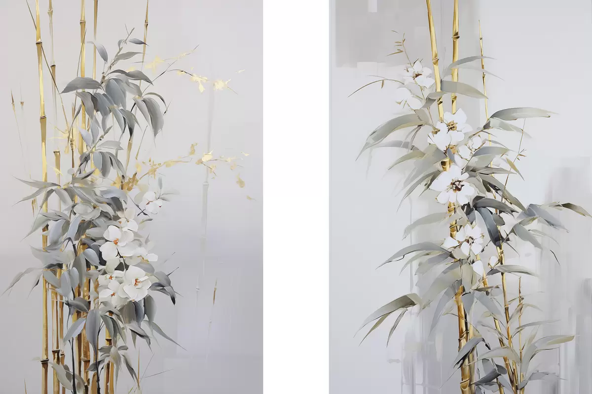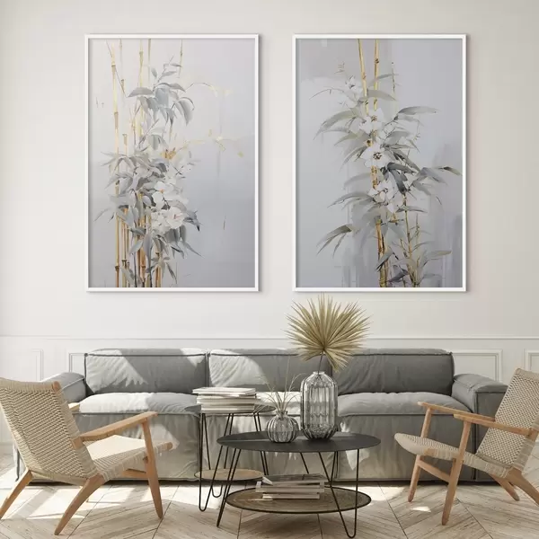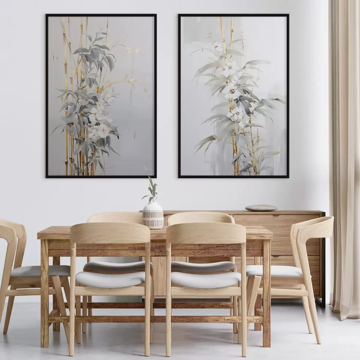 Poster Abstrakte Bambusstämme mit gelben Akzenten, zarten weißen Blüten und hellgrünen Blättern, grauer Hintergrund d01127