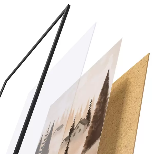 Das Poster besteht aus einem Rahmen, Plexiglas, einem gedruckten Bild und einer Rückwand aus Spanplatten. Dank der Halterungen auf der Rückseite kann das Poster sofort an die Wand gehängt werden.