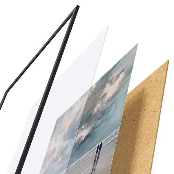 Das Poster besteht aus einem Rahmen, Plexiglas, einem gedruckten Bild und einer Rückwand aus Spanplatten. Dank der Halterungen auf der Rückseite kann das Poster sofort an die Wand gehängt werden.