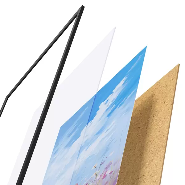 Das Poster besteht aus einem Rahmen, Plexiglas, einem gedruckten Bild und einer Rückwand aus Spanplatten. Dank der Halterungen auf der Rückseite kann das Poster sofort an die Wand gehängt werden.